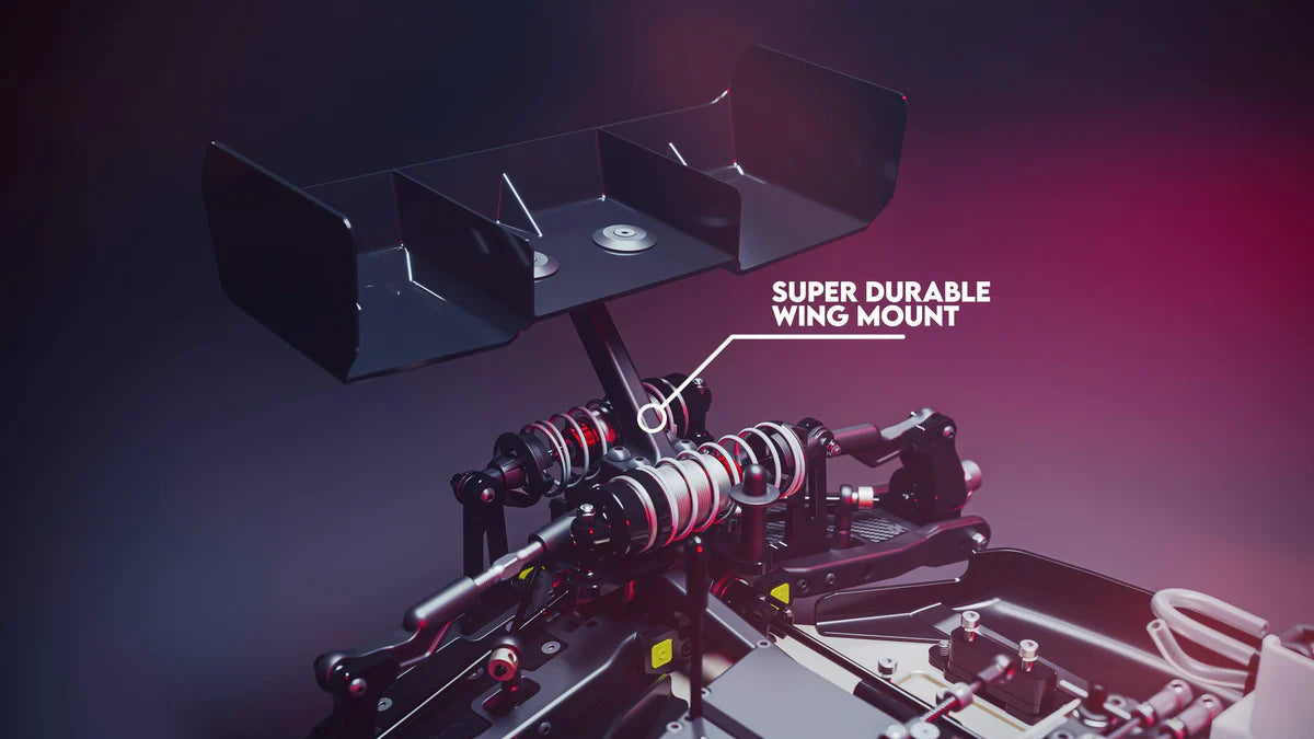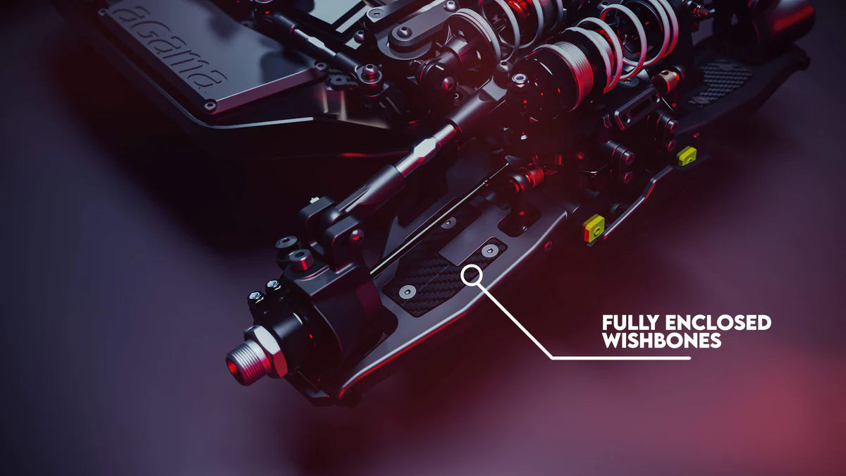 INTRODUCING THE AGAMA N1 BUGGY. After years of development our revolutionary design concept is finally realised with the production N1. Its unique suspension creates an incredibly low COG (Centre of Gravity) race car, while our engineering teams years of experience has pushed us to ensure that not only is it fast, but it’s the easiest car to work on in its class. Lower COG makes the N1 more consistent to drive while being able to hold higher corner speeds than your average 1/8th buggy. Its not just in the corners where the N1 excels, through bumps it stays very flat with less tendency to want to flip over and in the air the N1 flies very low and stable as its unique clean aerodynamics have a tremendous effect, working the rear wing to maximum efficiency.
