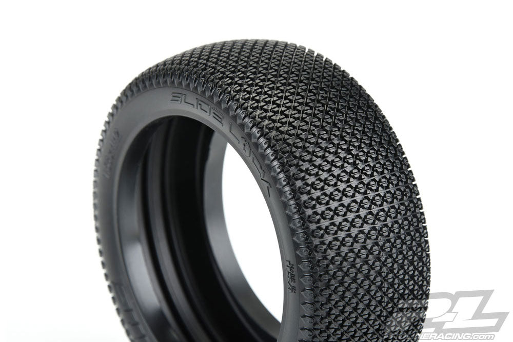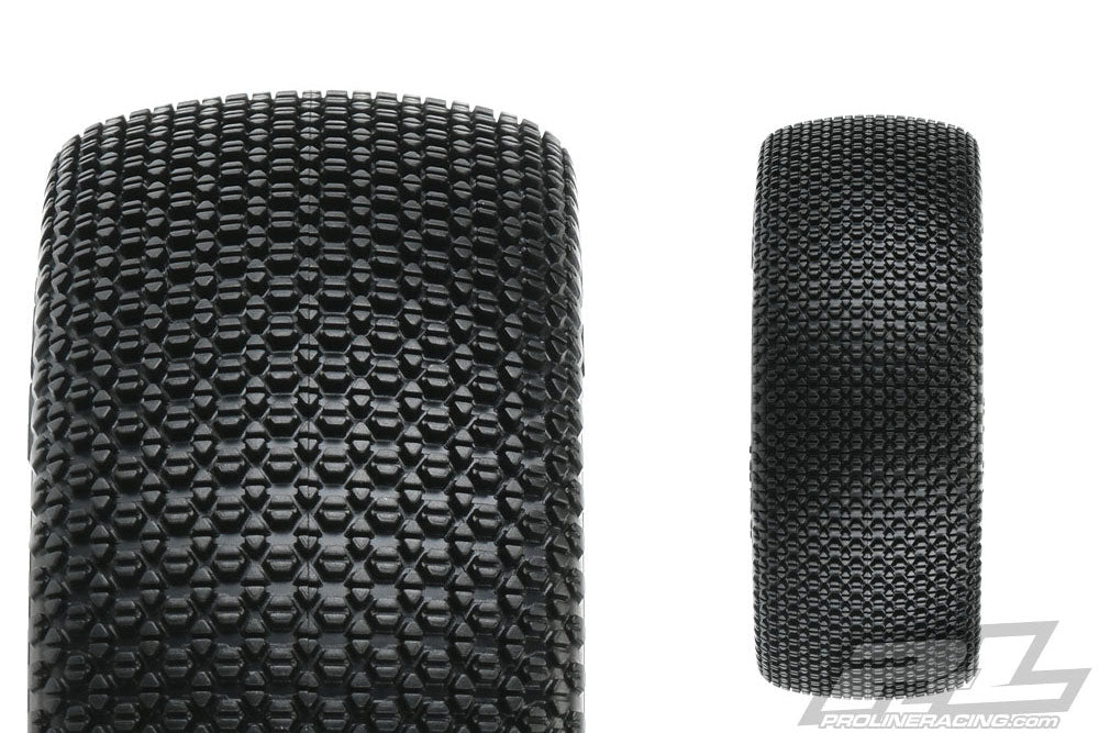 The Slide Lock is a unique new tire design from Pro-Line that is made specifically for smooth, low grip tracks. The Slide Lock features a pattern of small, tightly packed hexagon and triangle shaped pins so you can lay down as much rubber as possible. The tread on the new Slide Lock is laid out wider across the tire carcass for a flatter profile overall compared to other Pro-Line 1:8 Race Tires. Each hexagon pin has a deep sipe down the middle of the tread for added flex and grip on even the slickest of surfaces. The built-in tread flex means you can run harder compounds for longer wear and still have good traction when you need it. The large and stiff side pins reach far down the sidewall to reduce edginess as much as possible. Be the first at your track to win with Pro-Line’s new Slide Lock tire. Get yours today!